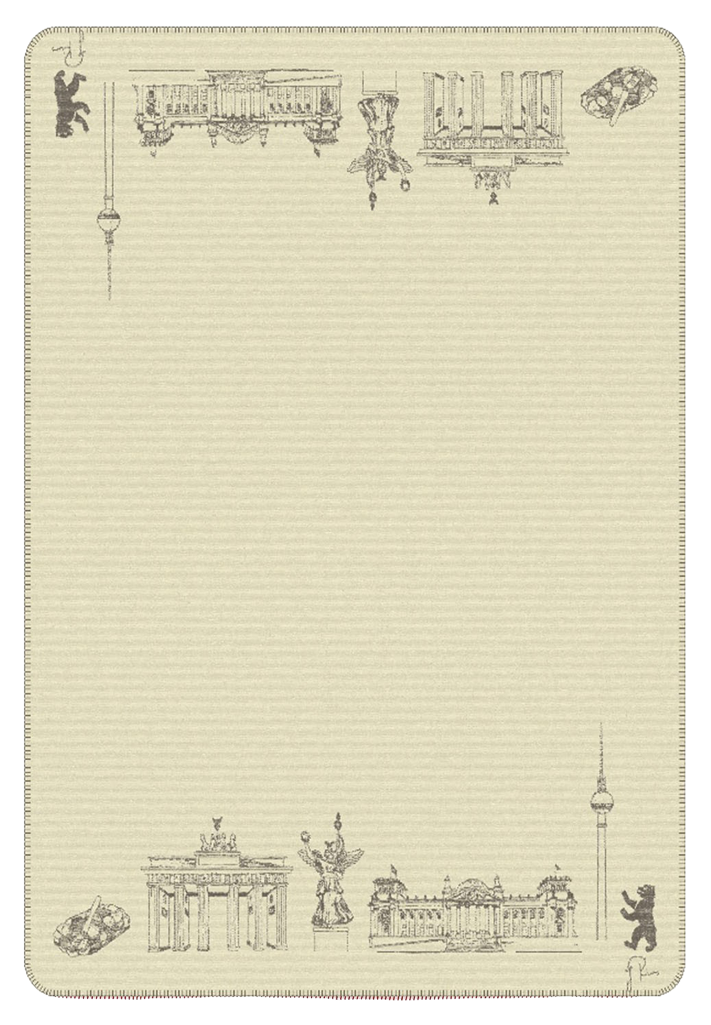 Der Berlin Kolter verbindet Design und Handwerk auf einzigartige Weise. Jedes Detail – vom Brandenburger Tor bis zur Siegessäule – wird nicht gedruckt, sondern gewebt. Das Ergebnis ist eine Decke mit spürbarer Struktur, hoher Haltbarkeit und authentischem Hauptstadt-Gefühl. Made in Germany – aus Liebe zum Detail.