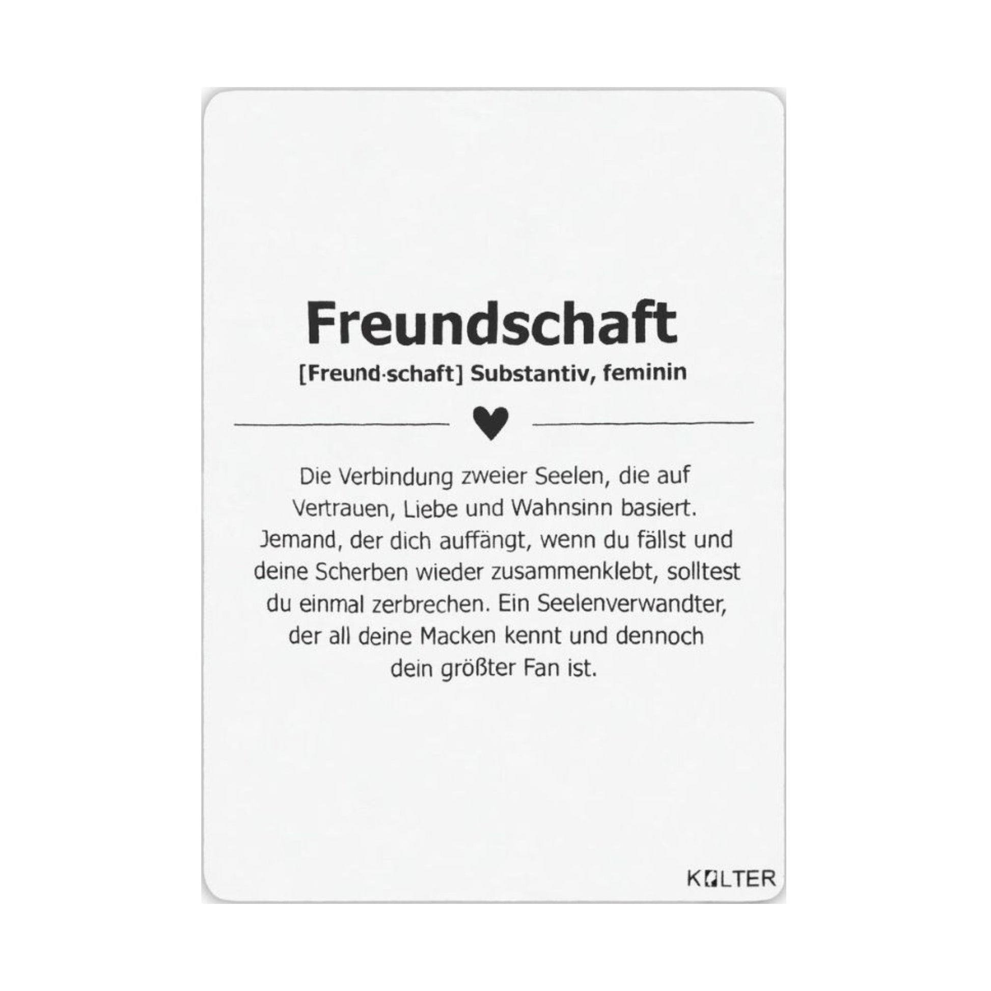 Der Definitionskolter „Freundschaft“ ist eine warmherzige Botschaft für genau diesen Menschen: deinen Seelenverwandten, der deine Macken kennt, dich aber trotzdem feiert und immer an deiner Seite ist.